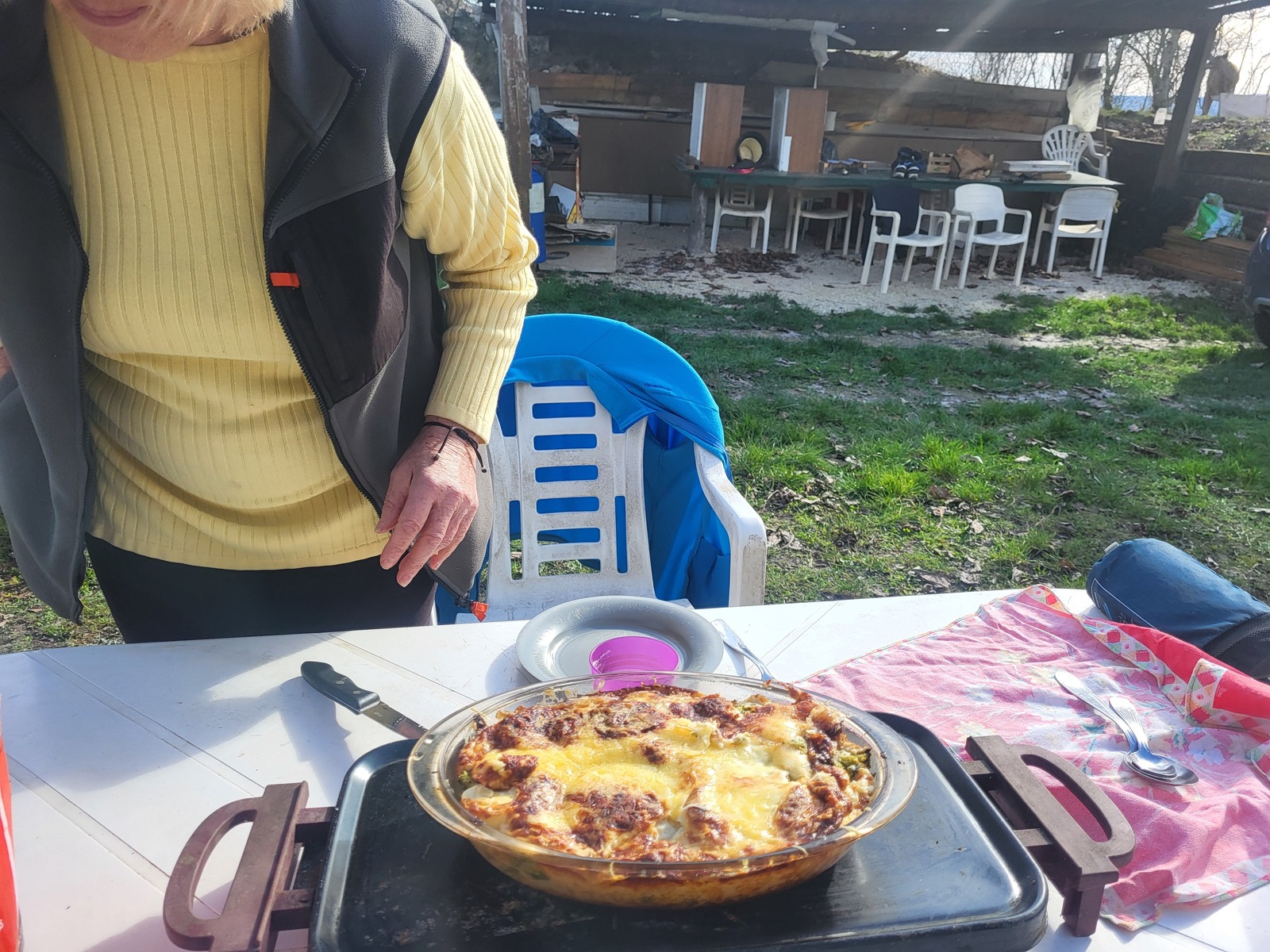 Et oui, un rayon de soleil et il y en a deux qui vont s'exercer au tir à l'arc dans la colline. Après bricolage du matin et avant de tirer quelques volées cet après-midi, un petit encas les attends. A midi, c'était jambonneaux et gratin de choux fleur brocolis béchamel au barbecue.